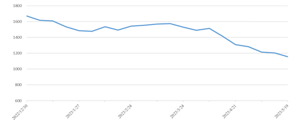 華南區(qū)域:受房地產(chǎn)行情震蕩影響,陶瓷需求恢復(fù)不及預(yù)期開窯率在50%左右,導(dǎo)致出運量仍然處于低位。本期華南指數(shù)報收1546點,環(huán)比下跌7點,跌幅0.45%,其中華南至東北指數(shù)報收1059點,環(huán)比下跌37點,跌幅3.38%,華南至華北指數(shù)報收1429點,環(huán)比下跌20點,跌幅1.38%。
