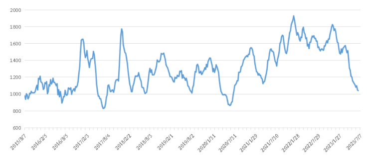 本期2023年7月1~7日中國(guó)內(nèi)貿(mào)集裝箱運(yùn)價(jià)指數(shù)(XH·PDCI)小幅下滑報(bào)1041點(diǎn),環(huán)比下跌8點(diǎn),跌幅0.76%;同比下跌587點(diǎn),跌幅36.06%,同比持續(xù)跌幅較大。其中東北、福建、華南區(qū)域指數(shù)上漲,華北、山東、華東區(qū)域指數(shù)下跌;華南至東北、華南至華北流向指數(shù)上漲,東北至華南、華北至華南流向指數(shù)下跌。六只區(qū)域子指數(shù)“3漲3跌”,四只流向子指數(shù)“2漲2跌”。